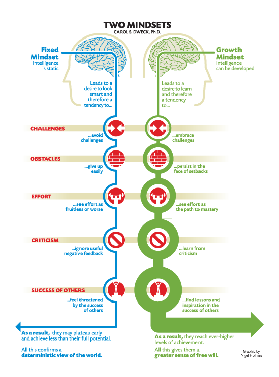 For those unaware of how Dweck’s ground-breaking approach to intelligence supports learning for all below is terrific infographic (courtesy of Nigel Holmes).