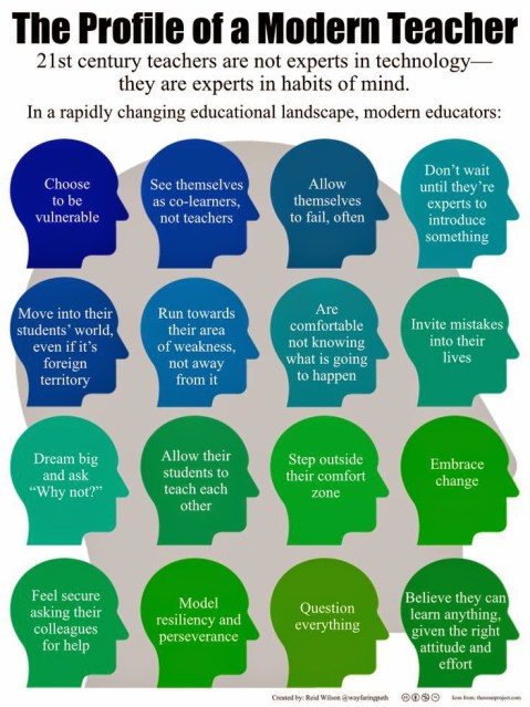 Below is a simply elegant and amazingly rich infographic courtesy of Reid Wilson (@wayfaringpath) that clearly defines what it means to be a teacher in the new realm of education (full disclosure: none of it has anything to do with mastering anything including technology!).