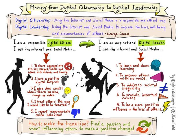 Changing the use of the internet and social media has been rapid. George Couros very neatly differentiates the shift: while digital citizenship is about using the internet and social media in a responsible and ethical way, digital leadership asks us to use the internet and social media to improve the lives, well-being, and circumstances of others.